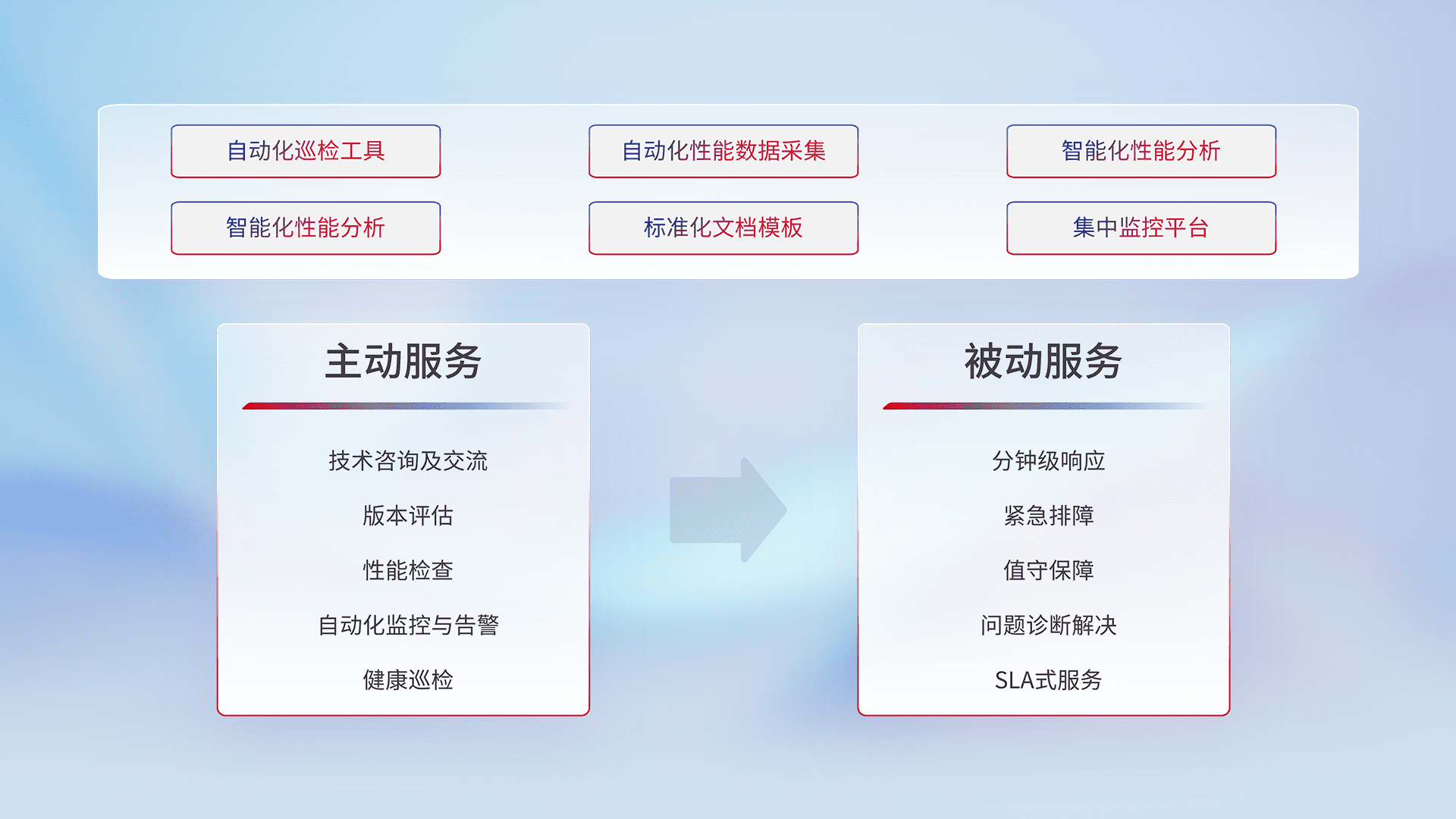 智能化工具和标准化文档,,保障服务质量,,,,提供主动服务(包含技术咨询、、、版本评估、、性能检查、、、自动化监控与告警、、、、健康巡检)和被动服务包含(分钟级响应、、、紧急排障、、、值守保障、、、问题诊断解决、、、SLA服务)。。